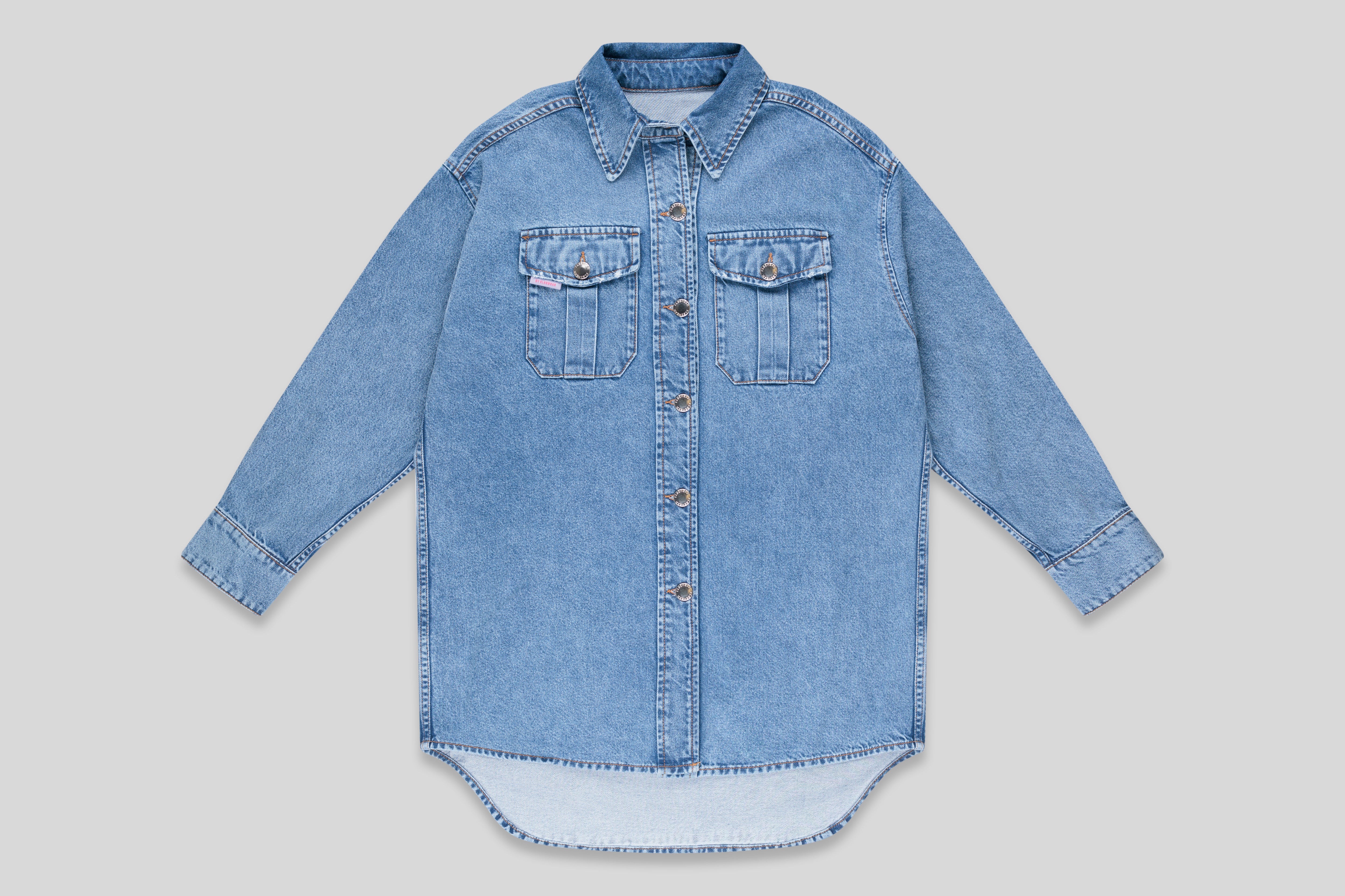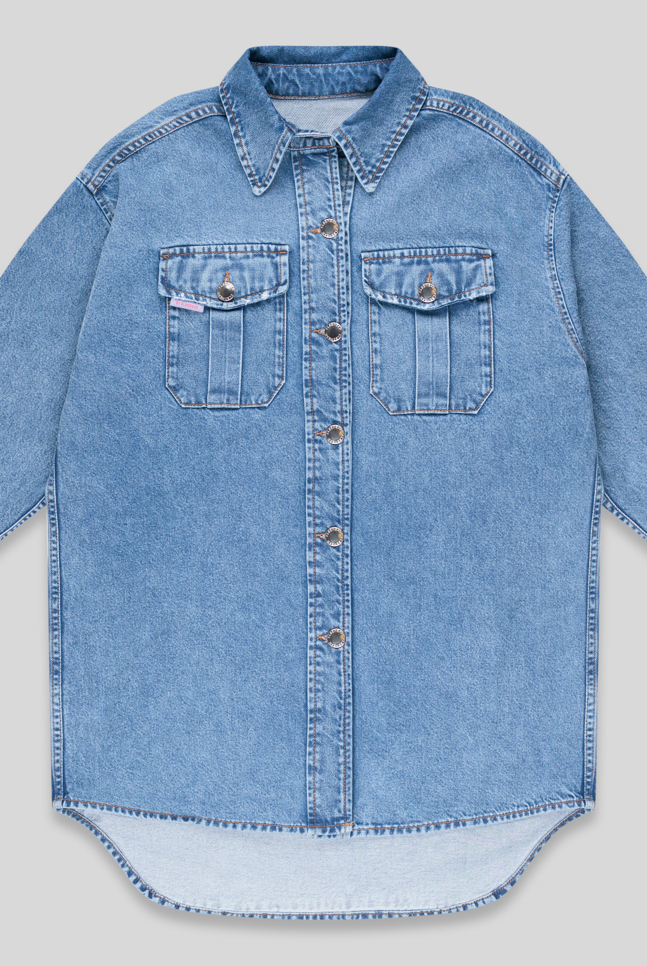 Koszulo-sukienka denimowa o kroju oversize. Możesz ją nosić na wiele sposobów! Zapiętą, rozpiętą, jako sukienkę. Ma wydłużony tył. Ozdobiona logowanymi srebrnymi guzikami, nitem w kształcie muchy oraz naszywką z logo „BY ELSEWEAR”.