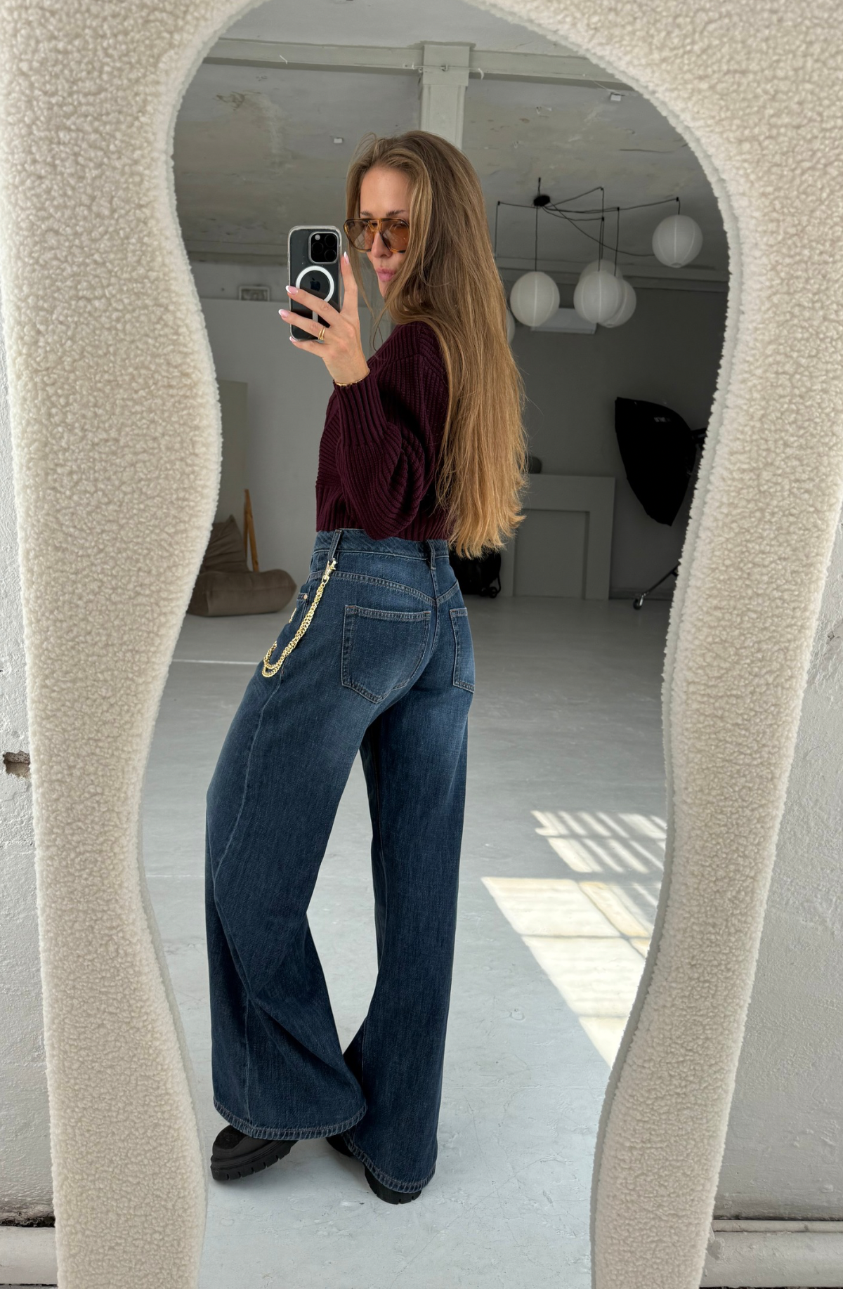 Jeansy w kolorze granatowym z nieregularnym wytarciem. Wysoki stan, na przednich kieszeniach cięcia, które pięknie modelują sylwetkę. Materiał jest lekki, lejący się, 100% bawełniany. Łańcuch w subtelnym jasnozłotym kolorze w zestawie ze spodniami. Można go odpiąć i nosić z innymi spodniami, bądź też torebką. Rozmiar wypada standardowo, modelka ma 170cm wzrostu i ma na sobie rozmiar S. Pamiętaj, że jeśli spodnie będą za długie skrócenie u nas jest zawsze darmowe! Płacisz jedynie za przesyłkę, a my skracamy z zachowaniem oryginalnego podwinięcia.