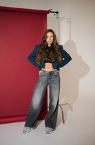 Cieniutki denim, srebrne logowane akcesoria. Holograficzna naszywka pięknie mieni się w promieniach słońca na różne kolory! Na tylnej szlufce różowy kryształ. Rozmiar wypada standardowo. Tkanina to 100% bawełniany miękki denim.