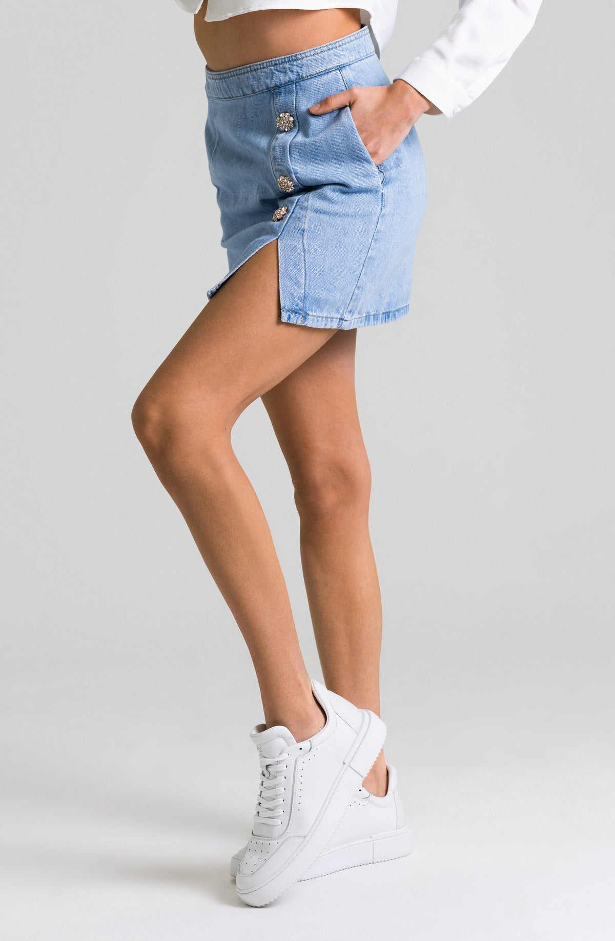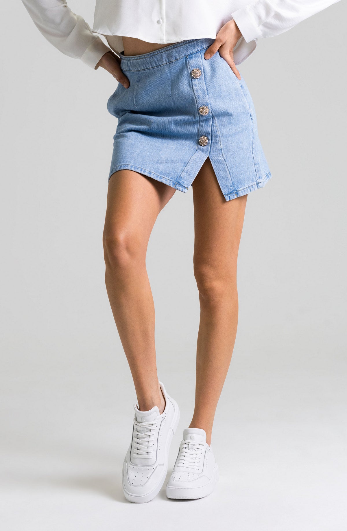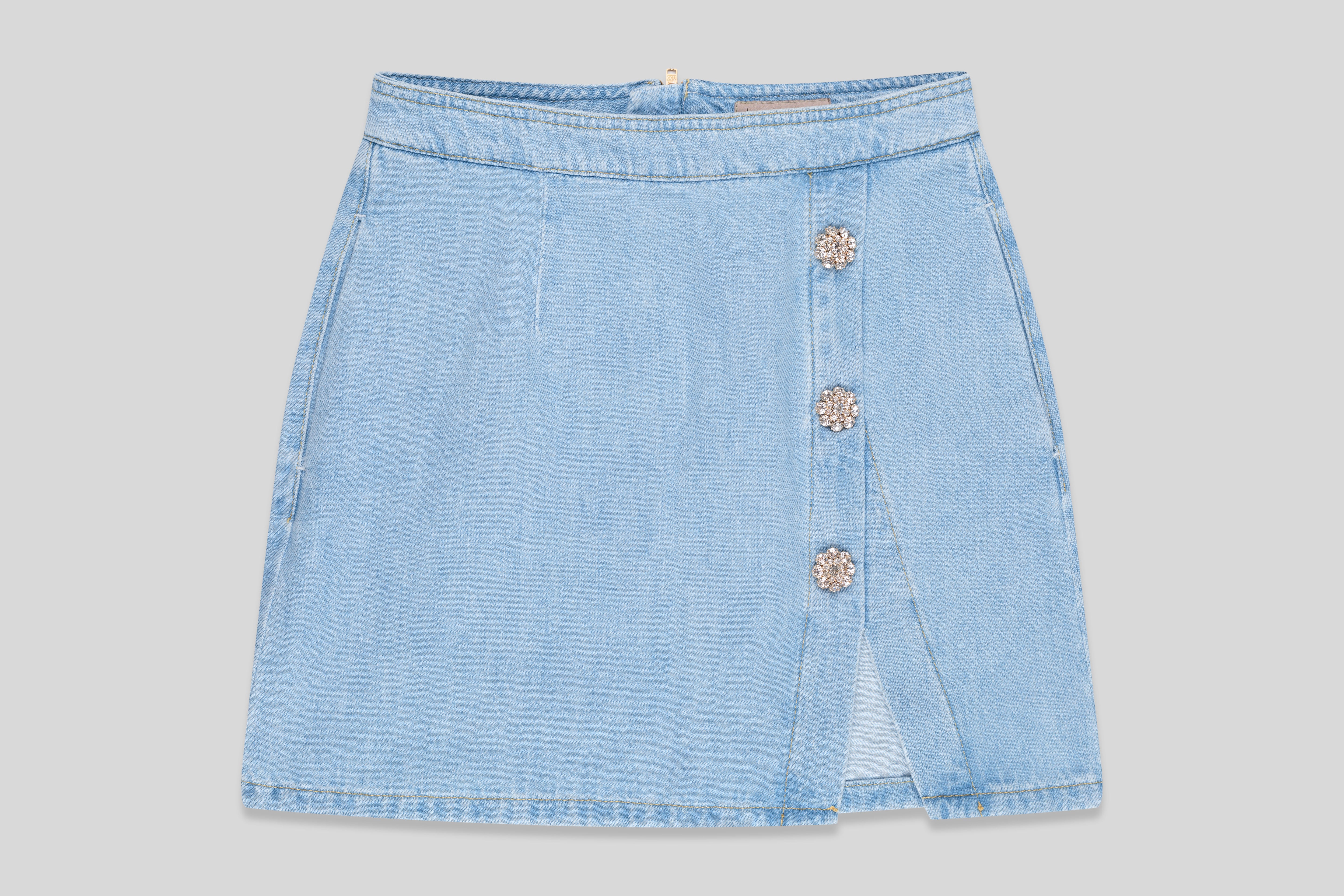 Spódniczka, którą pokochałyście od samego początku! Wykonana z cienkiego 100% bawełnianego jeansu, który wygląda na „vintage”, ale dzięki procesowi uszlachetniania jest niezwykle miękki i opływający. Ręcznie naszywane, ozdobne guziki z kryształami nadają zwykłej spódniczce niezwykłego charakteru. Seksowny rozporek pięknie układa się podczas chodzenia eksponując nogi.