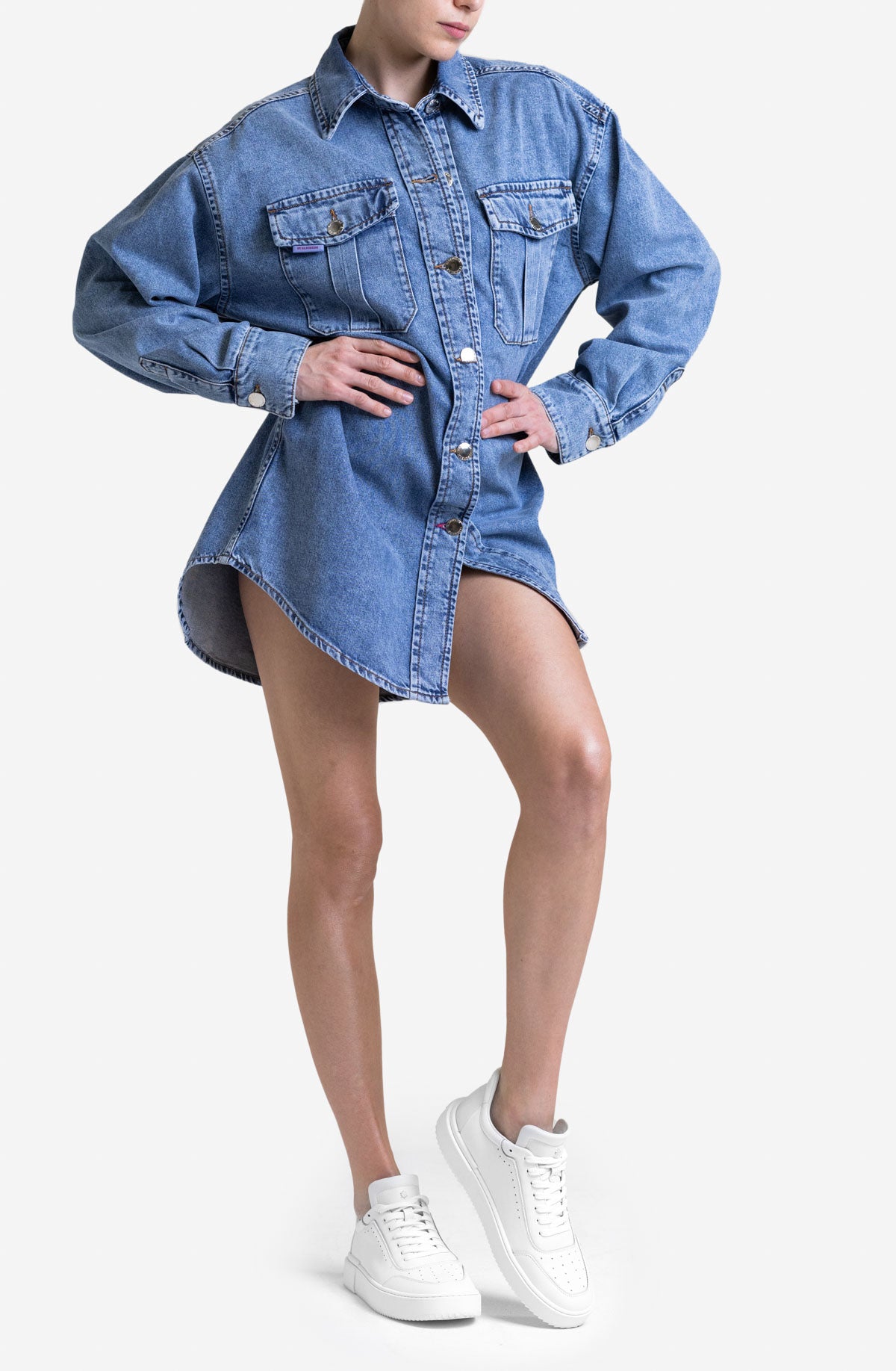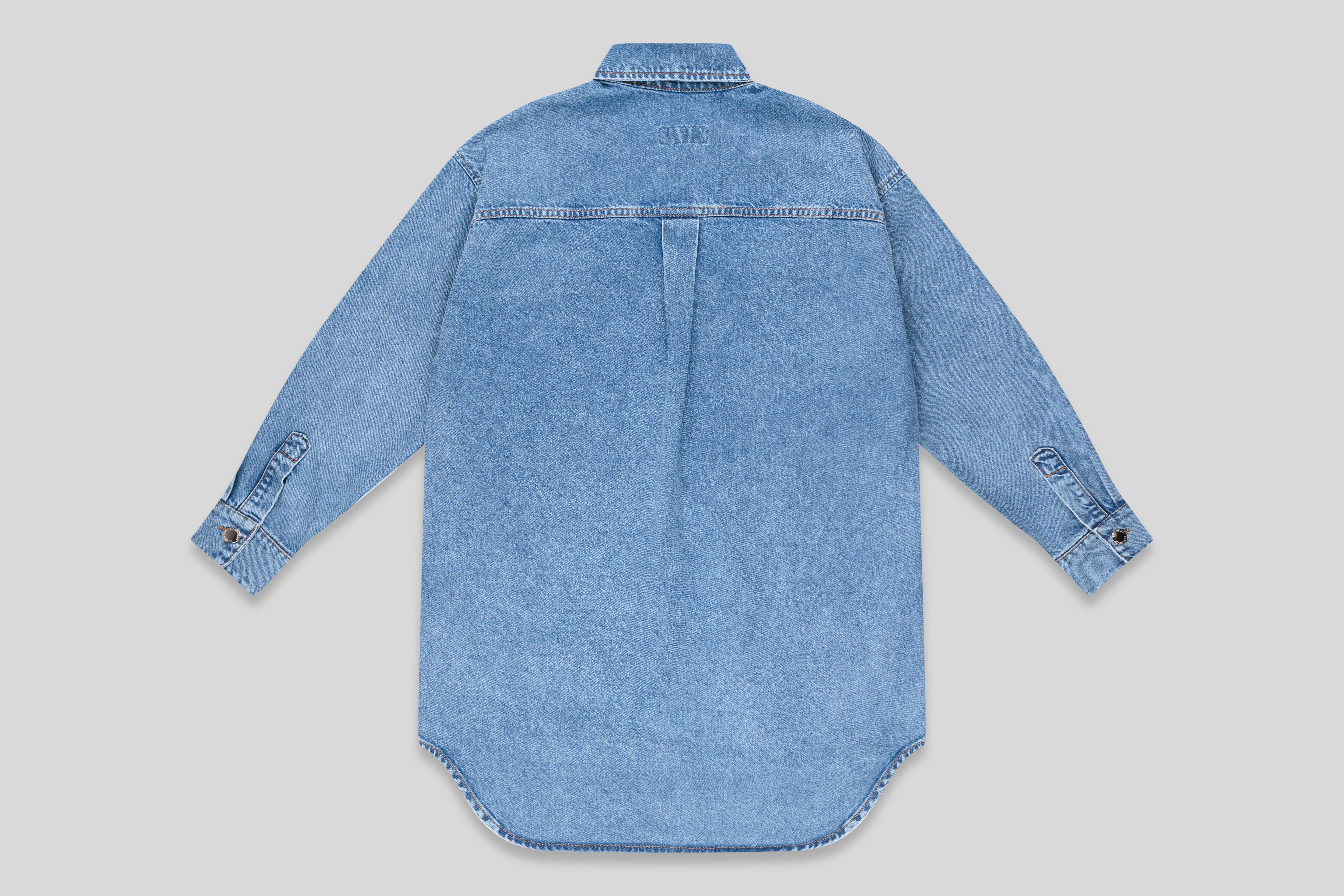 Koszulo-sukienka denimowa o kroju oversize. Możesz ją nosić na wiele sposobów! Zapiętą, rozpiętą, jako sukienkę. Ma wydłużony tył. Ozdobiona logowanymi srebrnymi guzikami, nitem w kształcie muchy oraz naszywką z logo „BY ELSEWEAR”.
