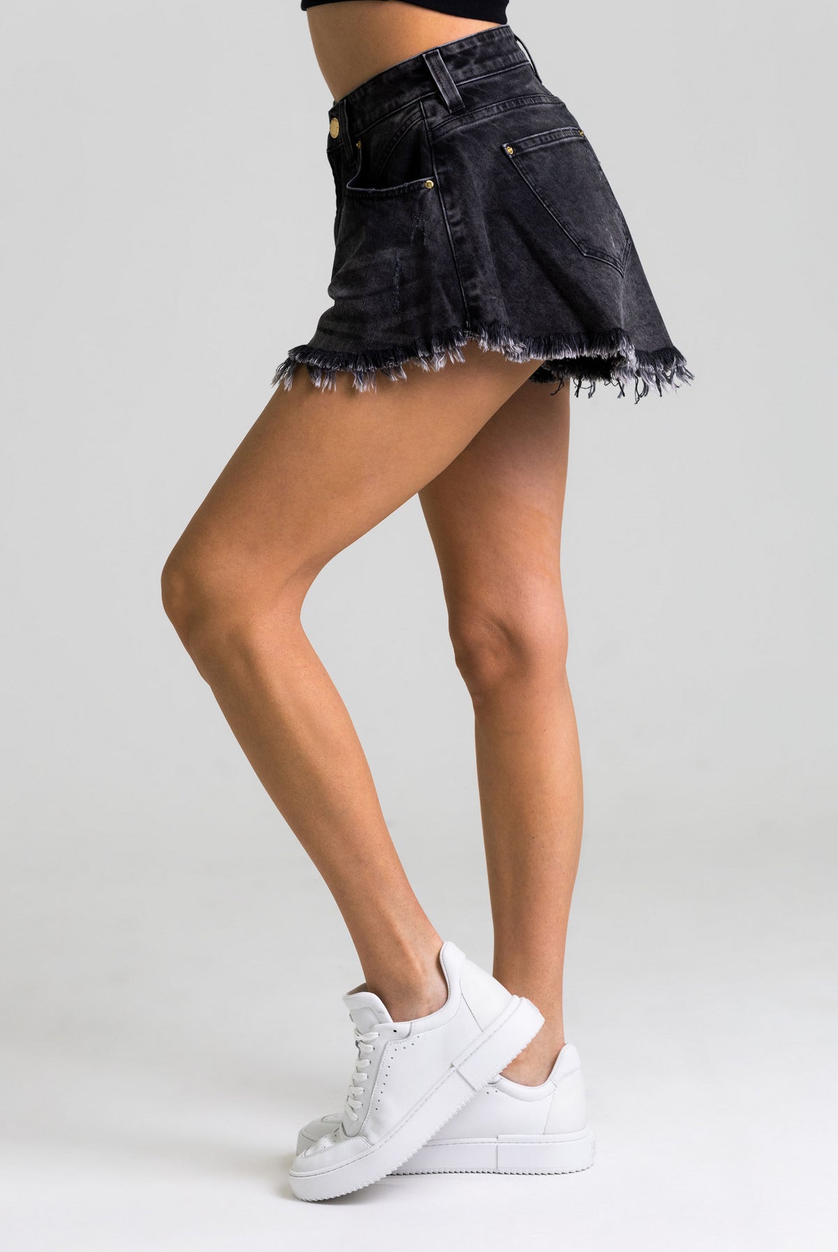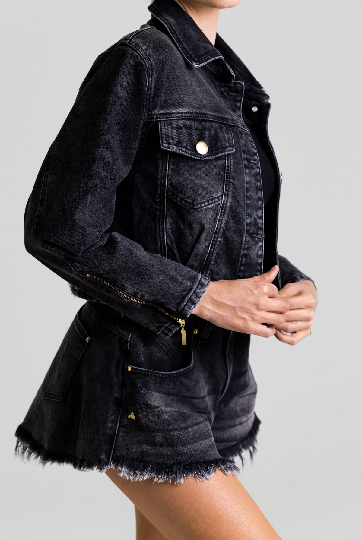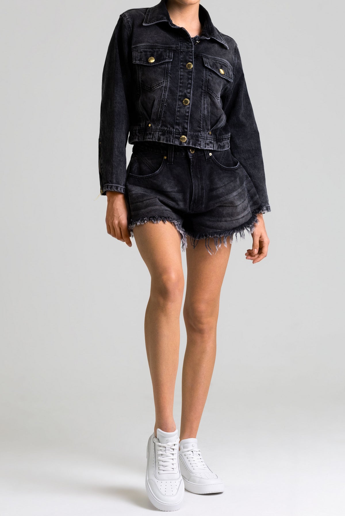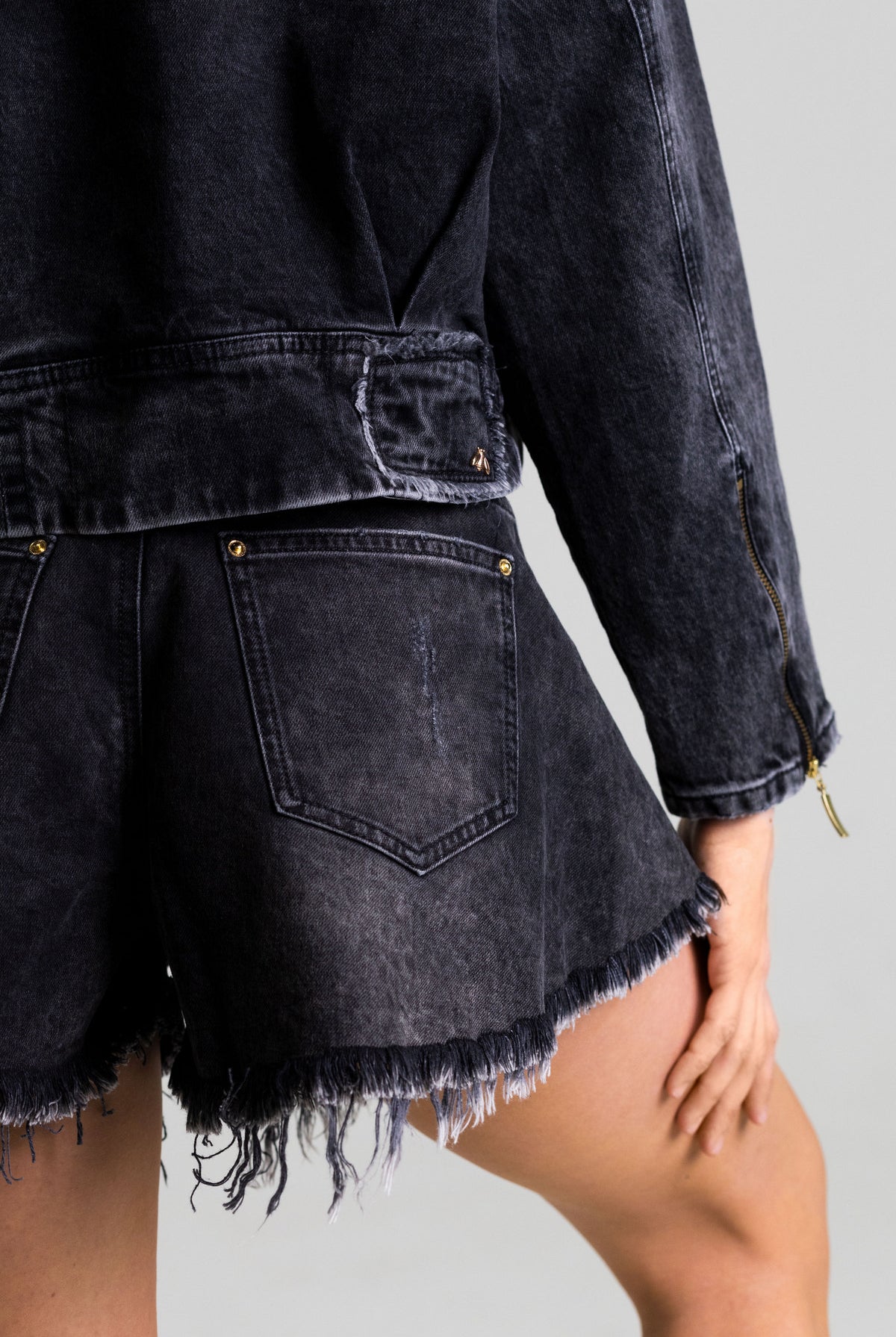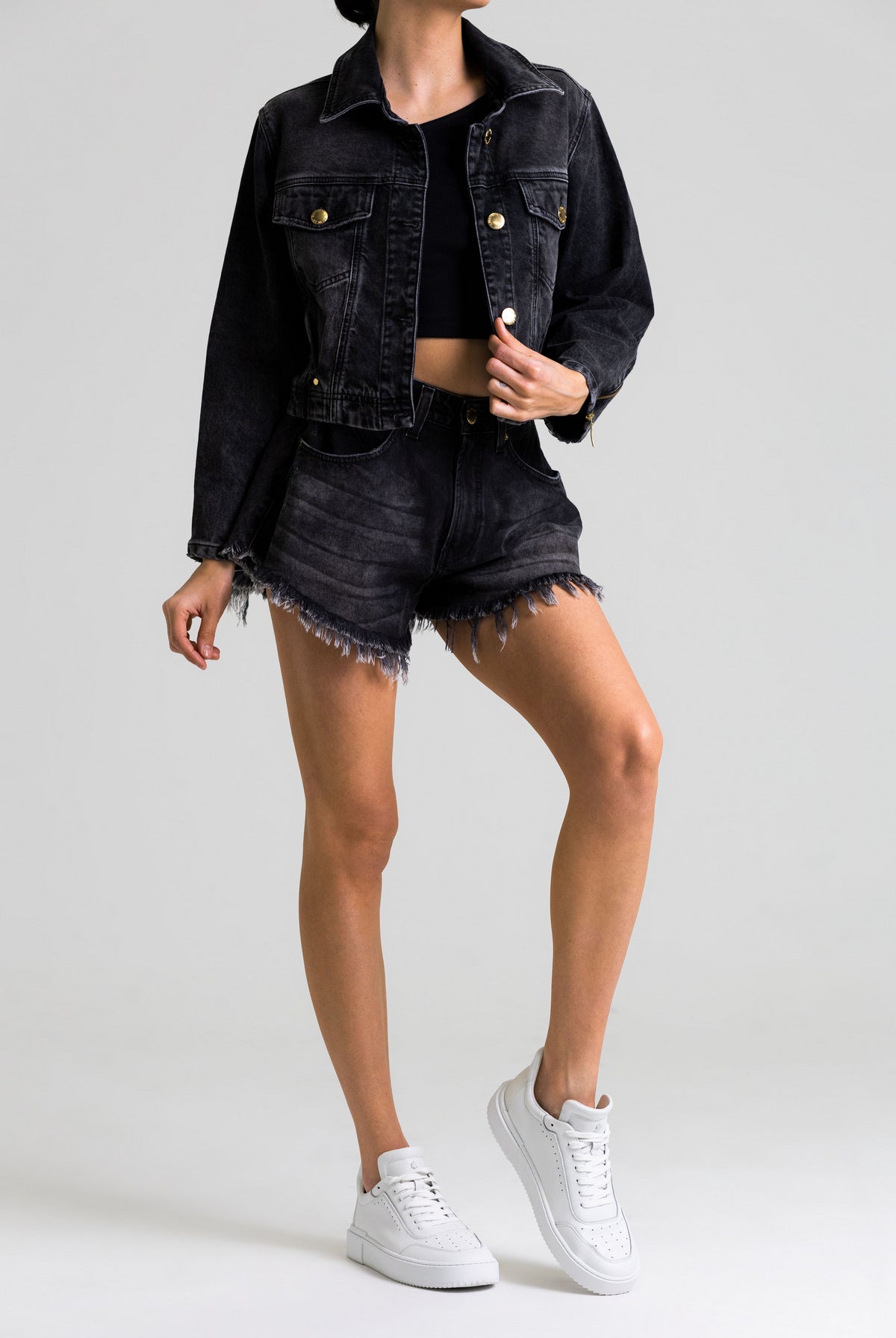 Szorty w kolorze czarnym z efektownymi przetarciami na przodzie i tyle szortów. Wykonane z jeansu składającego się w 99% z bawełny organicznej. Logowane guziki oraz holograficzna naszywka pięknie mienią się w promieniach słońca! Na nogawce dodatkowo ozdobna mucha w złotym wykończeniu. Świetnie pasuje do naszej kurtki AVRIL w tym samym kolorze! Tkanina wygląda na „vintage”, a w rzeczywistości jest niezwykle miękka i lekko naddająca się.