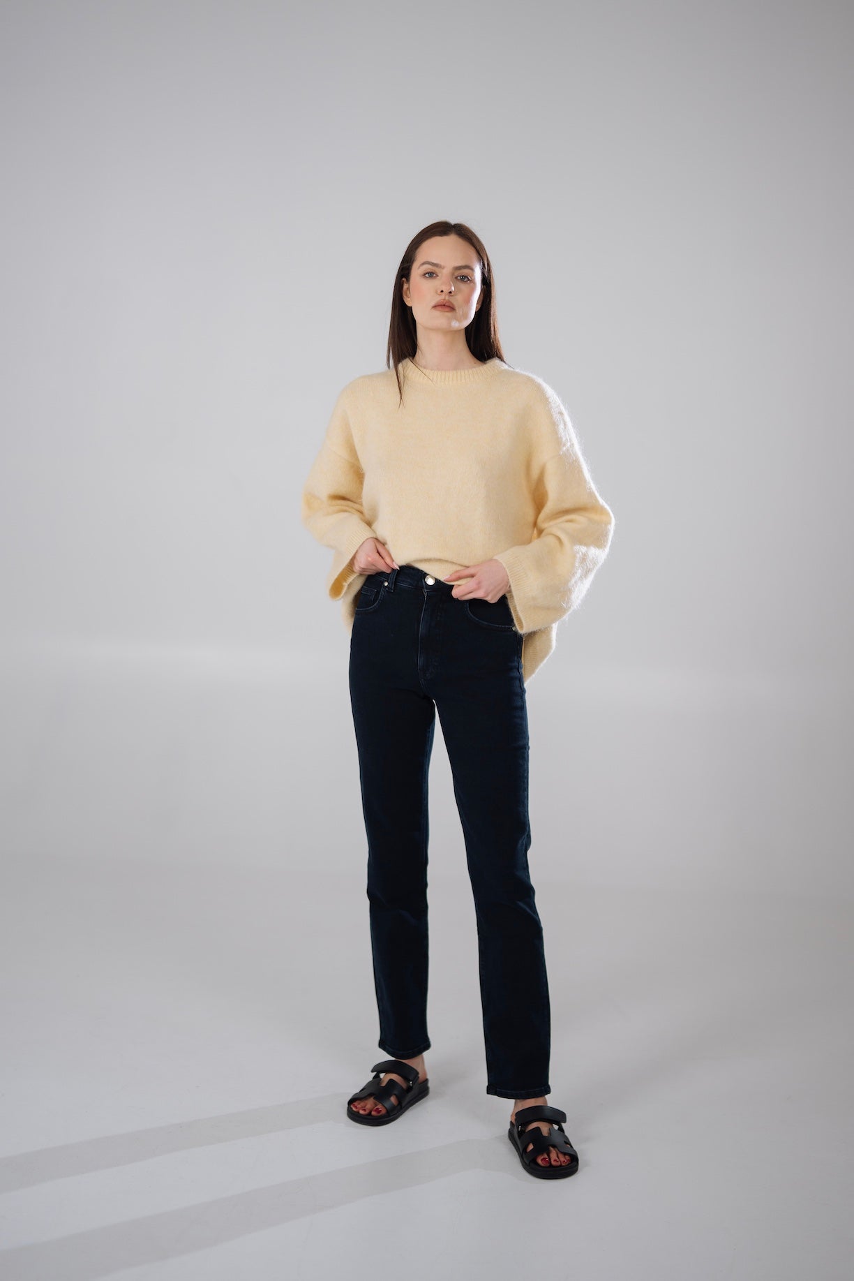 Jeansy z… KASZMIREM? Tak! Kochamy niestandardowe rozwiązania, a jak tylko ten materiał wpadł w nasze ręce… przepadliśmy! Tak miękkich i przyjemnych w noszeniu spodni denimowych jeszcze nie miałaś. Piękny ciemnogranatowy kolor wyszczupla i jest bardzo uniwersalny w tworzeniu stylizacji. Wysoki stan oraz prosta nogawka optycznie wydłużają sylwetkę i podkreślają talię.
