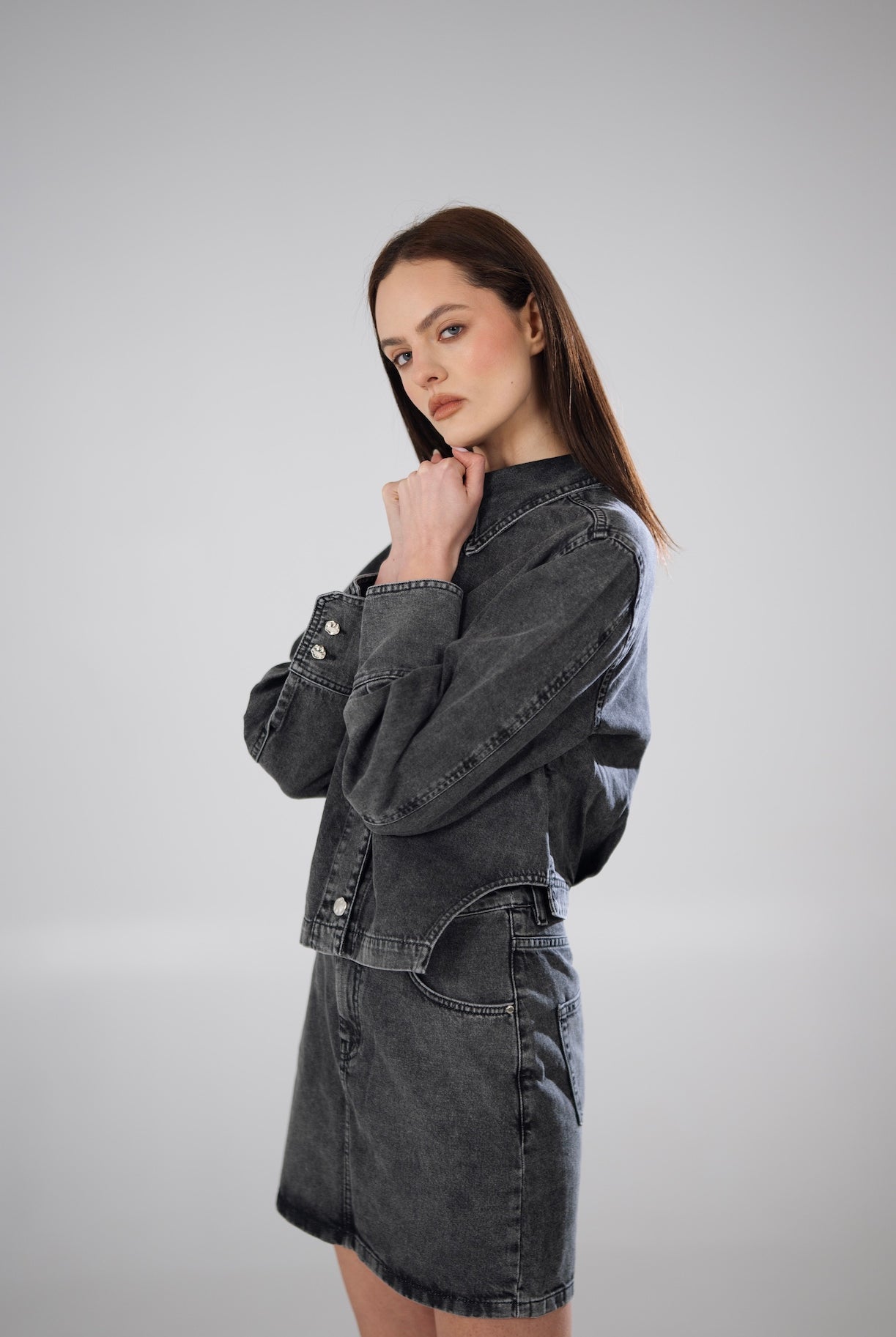 Denim shirt with an asymmetrical cut. You can wear it in many ways! Buttoned, unbuttoned, as a shirt, or as a thin jacket. The wide cuff gives the whole thing character. Decorated with logo silver buttons that beautifully emphasize the blue shade of the fabric.
