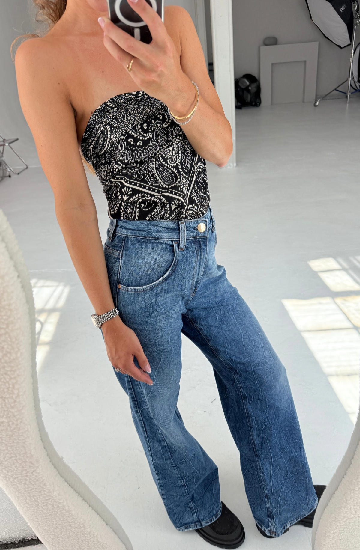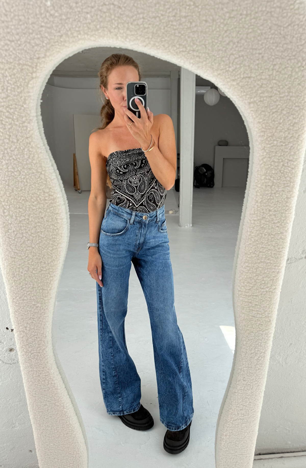 Idealne jeansy nie istnieją? Nie u nas! Poznajcie fantastyczny model MIMI, który został skonstruowany w taki sposób, aby wydłużyć i wyszczuplić sylwetkę oraz wspaniale ukształtować pośladki. Wybraliśmy denim, który w składzie ma lyocell, dzięki czemu wspaniale układa się przy szerokiej nogawce oraz jest nieziemsko miękki i lekki. To zdecydowanie model spodni, który będziecie nosić na co dzień, jak i na wyjścia (tak, świetnie wygląda do białej koszuli i szpilek!). Akcesoria, których użyliśmy są lekko błyszczące co pięknie podkreśla kolor materiału. Pamiętaj, że jeśli spodnie będą za długie skrócenie u nas jest zawsze darmowe! Płacisz jedynie za przesyłkę, a my skracamy z zachowaniem oryginalnego podwinięcia. Spodnie mimi może skrócić najwięcej o 5cm.