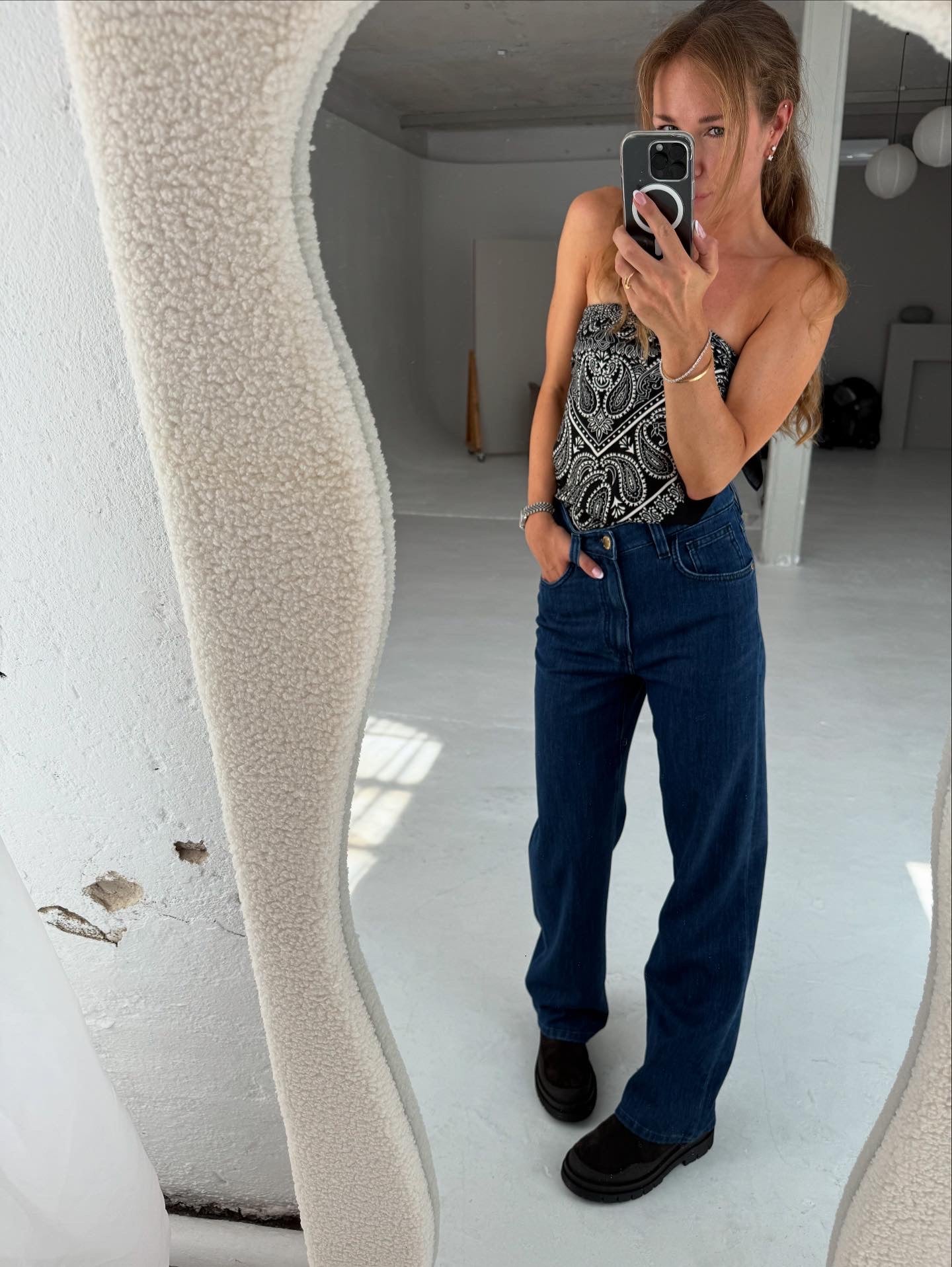 Jeansy VAMP z tkaniny jakiej jeszcze nie widziałyście! Jeans w pięknym niebieskim kolorze, który jest bardzo cienki, lejący się, niezwykle przyjemny w noszeniu denim, który subtelnie mieni się w promieniach słońca na złoto! Złote logowane akcesoria i holograficzna naszywka dopełniają charakteru. Wysoki stan oraz szeroka nogawka świetnie pasują do sneakersów oraz szpilek.